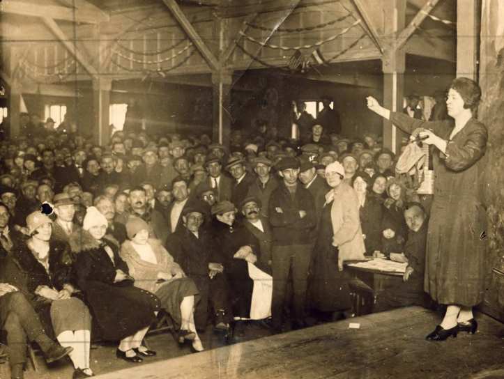 The sky grows darker, the electric lights are lit. A shout echoes through the town. It rises and swells. The young leader is being carried to the platform by his fellow workers. Elizabeth Flynn has just finished speaking. She has brought word that Miss Wilkinson, representing the striking miners of England, will bring their greetings to their striking brothers and sisters in Passaic.