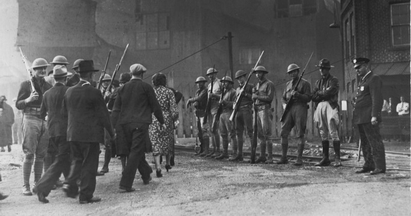 While playing the role of mildly amused spectators when company gunmen committed outrages, the state troops regularly arrested and clubbed workers. Even as I write, dispatches show that the West Virginia state police are “framing up” miners suspected of union sympathy at Fairmount, endeavoring to use the fact that the known disregard of safety laws rules in the open shop Bethlehem mines caused an explosion, to accuse union miners of destroying the mine and killing their fellow workers.