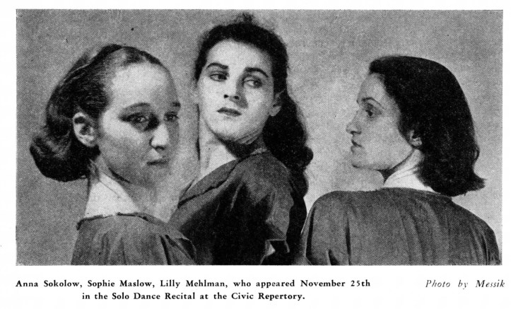 By comparison Awake by Miriam Blecher, March by Nadia Chilkovsky, and Challenge by the dance trio, Sophie Maslow, Anna Sokolow, and Lillian Mehlman, were less forceful. The composition of the March was more original and imaginative than Awake, which was little more than a well-performed cliche. The choreography of Challenge was interesting and varied but the dance lacked the spirit and force of Defiance. The upward thrust and leap of the central figure between the two crouched dancers did not convey its intended challenging and explosive character.
