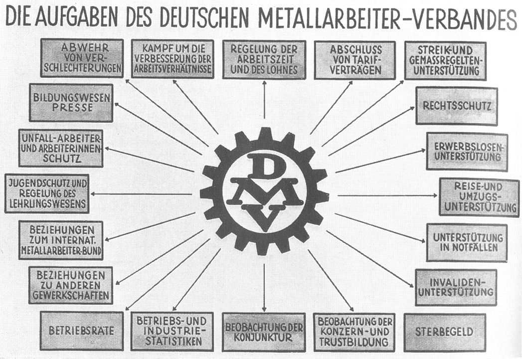 2. Thanks to the strength that comes from union and numbers, the Deutscher Metallarbeiterverband is able to furnish to its members special facilities–legal aid, library service, special courses for works council delegates, unemployment, strike and death benefits, and a research bureau–such as no other union in Germany or perhaps in Europe can supply.