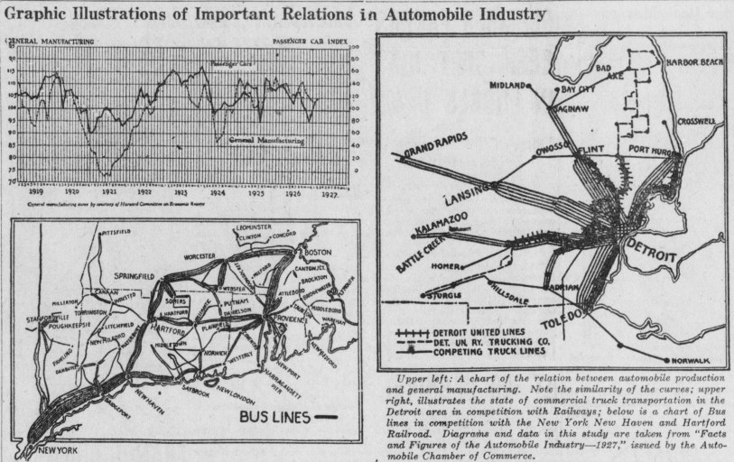 Need for all forms of transport serving the same territory is indicated in the map above filed by the Detroit United Lines with the Interstate Commerce Commission. The map shows the extent of truck roads and routes operating in areas which also have electric and steam road facilities. While the rail service is station to station and occasionally siding to siding, the truck service is rarely exactly competitive with rails, even between the same cities, because it is door to door.