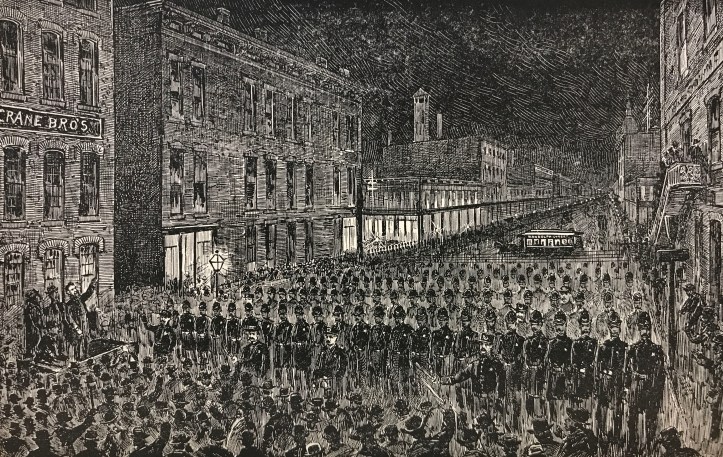 “The streets for blocks around the entrance were black with men and women, struggling to attend the great demonstration in memorial of the martyrs of the working people, murdered at Chicago.”