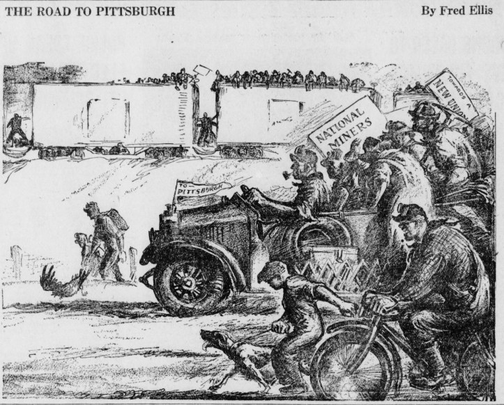 The business of the convention, at least in all essential details was sufficiently finished by two 6 o’clock Monday afternoon, so that when the deputies of the sheriff of Allegheny County arrived, closely preceded by a gang of Lewis sluggers riding high powered cars and armed with wrenches and black jacks, we could afford to adjourn. There was complete calm among the delegates at the belated declaration of the sheriffs deputies that no such convention could be held in this county. It was a calm tempered with a certain amount of exultation. After all of the hell of the preceding few days, the sheriffs action came as a kind of an anticlimax; Andy Mellon and the big bosses had locked the stable door after their old time work horses, the miners, were gone, kicking up their heels in freedom. The Lewis sluggers did not dare attack the delegates when they marched out, an hour later, having stopped to eat the good dinner provided in the kitchens of the workers’ home.