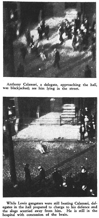 After losing their attack on the hall, the gangsters turned with the greatest ferocity to the dirty work of sniping individual delegates arriving alone and unprotected for the convention. Many were injured. One, Anthony Calamari, is, as this is written, still in a serious condition in Passavant hospital, with concussion of the brain. The Lewis sub-district organizer Buzzarelli jumped on his head after he had been knocked down with many blows, and the police were dragging him to the patrol wagon.