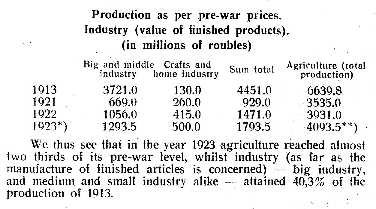 In order to characterize the situation generally, I here adduce an extended form of the table submitted to the 12. Party Congress by comrade Trotzky; this furnishes a graphic survey of the position of big industry, small industry and agriculture, alike in comparison with pre-war standards and with reference to the speed of development during the last three years.