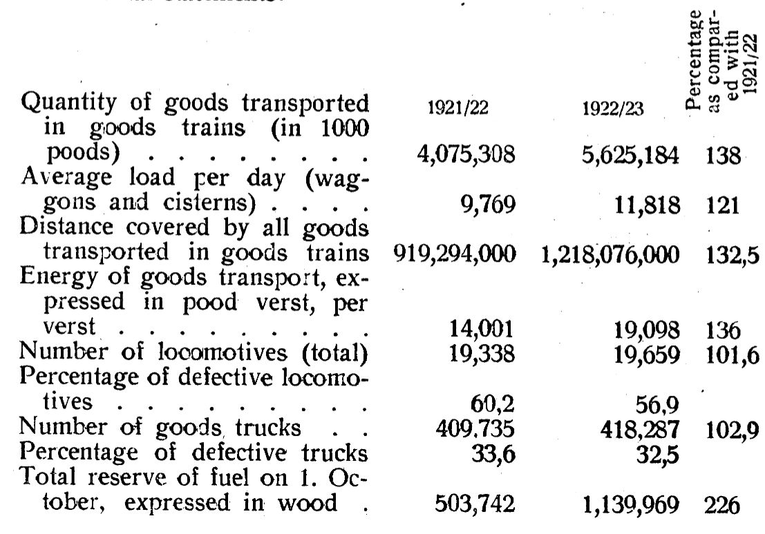 Transport is still being carried on at a loss, but the deficit is being rapidly reduced. In the year 1922/23, transport was subsidized to the extent of 115 million roubles, whilst in this year negotiations are being conducted with the People’s Commissariat for Traffic with reference to a sum of 40 to 80 million roubles; that is the amount required from the state for the support of transport has been reduced to at least half that of last year, although this subsidy covers the costs for the harbour constructions, river protection, etc., expenditure having nothing in common with the railways. If we take the railways alone, these will be working almost without a deficiency next year.