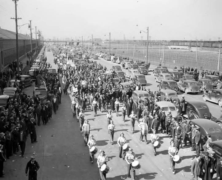The UAW workers used the tactic so skillfully applied in the 1937 sit-down strikes. They began in the best organized key department, where there was the largest number of trained and loyal union men. Gathered together and semi-armed with clubs of various kinds, they marched through the huge plants and gathered support, closing down department after department.