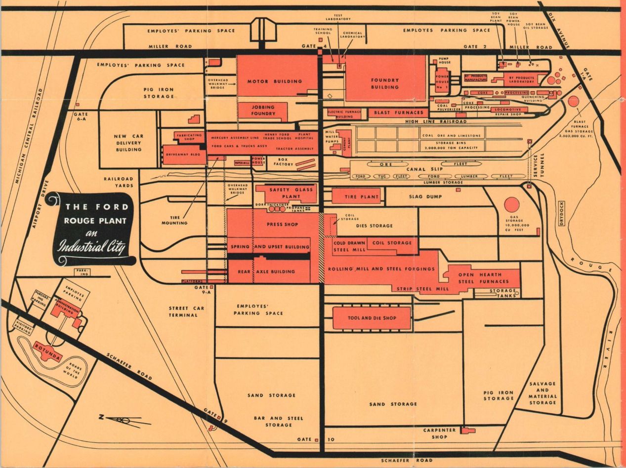 For over a mile along Miller Road is the plant, and on the other side of the road is the big private parking lot which is the property of Henry Ford. The situation is similar on the side entrances, Schaefer Road, Dix Road and Rotunda and Airport Drives.
