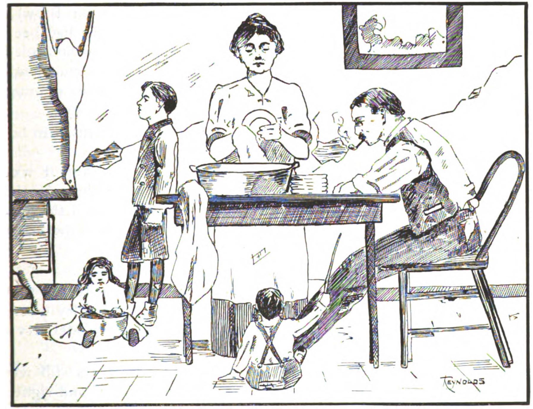 At two o’clock on Thanksgiving Day, garbed in their very best, Dan McCarty, his wife on his arm, and all the children began their long walk to Halsted street. With their free hands, Dan and Mary clutched the fists of Mamie and little Pete and kept them from falling over themselves. Kate piloted Buddie, and Skinny marched proudly before with a wary eye on Nick. For the moment, the tragedy of yesterday was forgotten by Skinny, in the joy of a new pair of shoes.