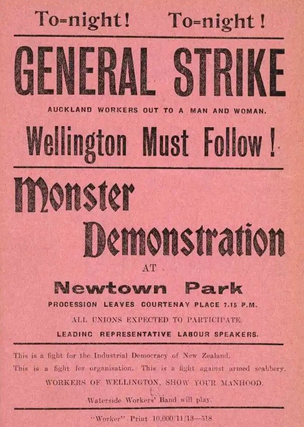 In Auckland a general strike was declared, and 26 of the largest unions tied Auckland up. Large meetings of 10,000 to 20,000 were held in Auckland, Christchurch and Wellington; enormous processions and splendid enthusiasm were the main features.