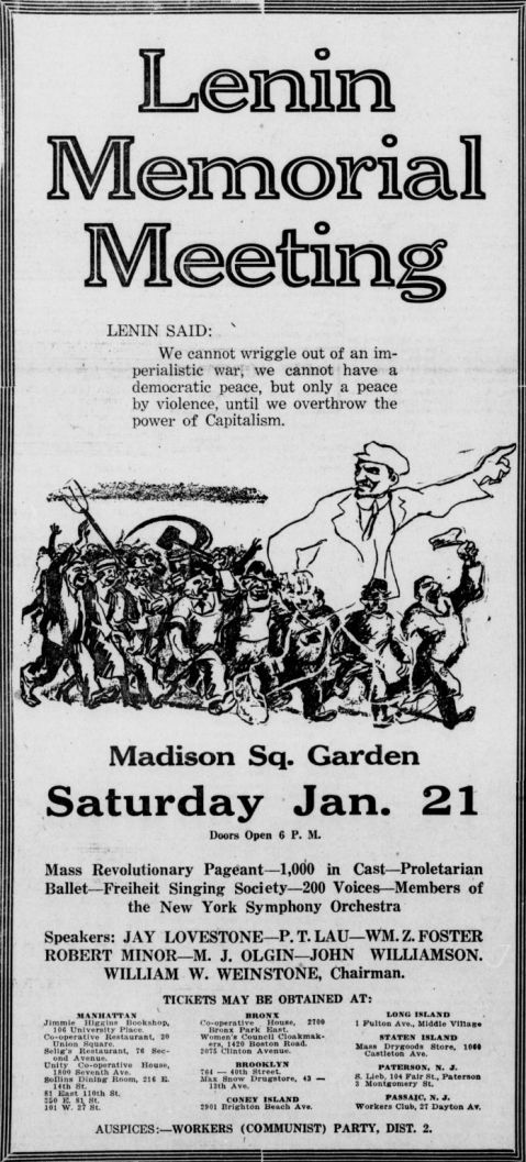 What must have been a remarkable sight. Olgin praises the mass-pageant commemorating Lenin at New York City’s Madison Square Garden on January 21, 1928.
