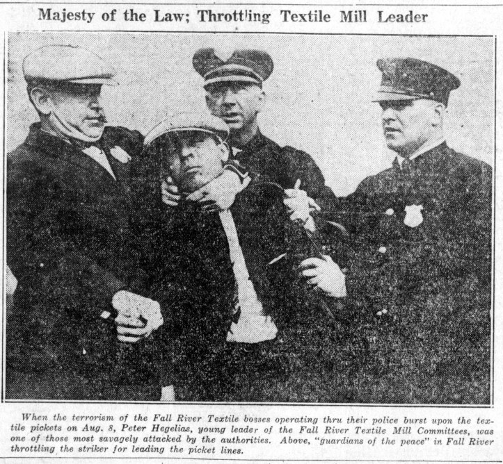 From the break-up of the first T.M.C. mass meeting in Fall River weeks before the strike, the Fall River police have carried out the role of company gangsters as openly as the Coal and Iron in any Rockefeller coal town. Police Chief Feeney, boasting of his personal supervision of police operations in the strike area, openly stated in the press the third day of the strike that he believed he was having success in “breaking the back of the strike.” Over a hundred arrests were made during the first days.