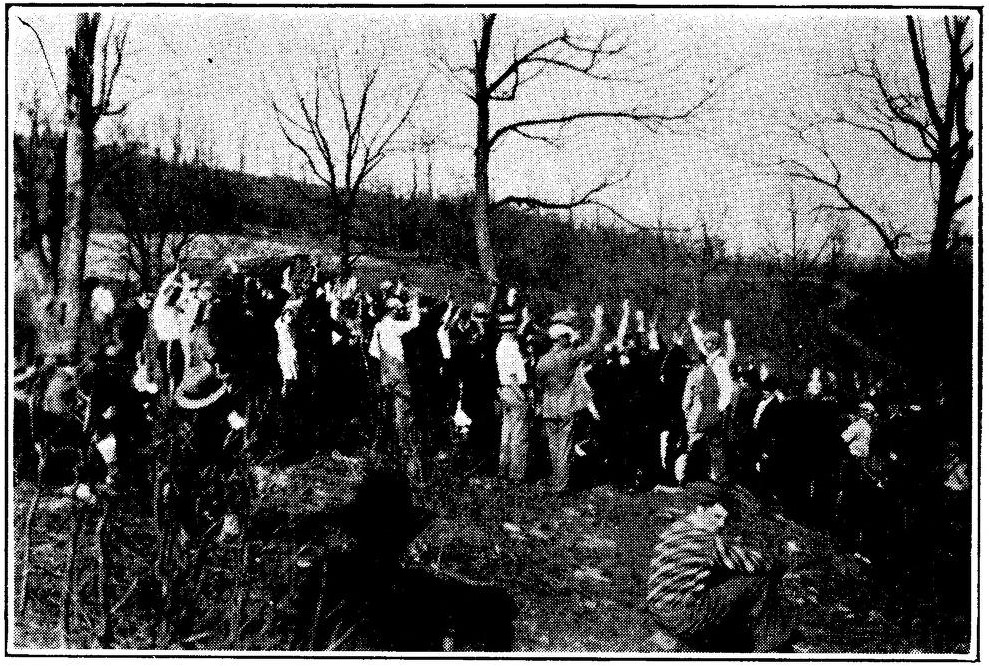 Because of geographical barriers and coal operator control, it is almost impossible to assemble 1,000 miners in the Kanawha valley. The hunger demonstration brought them together and they met, many of them for the first time, since the famous “Armed March” of 1921. A lot of stories were passed around, a lot of new resolutions made. There were eighty men there from Logan County — a place where miners are locked up like prisoners and who never before felt the warm solidarity of men massed together in a common misery. A story told in a speech by a Negro from Logan in the camp cannot be recorded here, but it is burned into the blood of a thousand coal diggers; and the rest of us who heard it will be a long, long time forgetting. While the miners were encamped, they listened to union speeches, to men talking for the Independent Labor Party of West Virginia, they wrote and learned to sing new songs of labor; and their own instinctive solidarity grew as the eventful days passed.