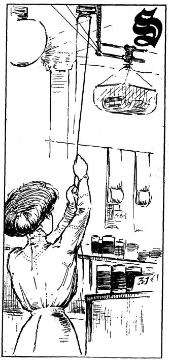 “Have you had your supper check yet? You HAVE? Gee, I wish I’d a had you bring me a sandwich. I haven’t had a bite since eleven o’clock. (Emerging from show case with a bolt of ribbon a hair’s breath more narrow than specifications):