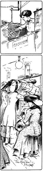 “This Alice blue? Five cents a yard. Ten yards? Yes, mam. (Measures off ten yards; makes out check.) (Aside to next saleswoman):