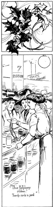 “Hollyberry ribbon? Yes, mam. No, mam. It’s something NEW. Twenty cents a yard. You saw the same thing at Hillman’s for twelve cents? Is that so? No’m, I suppose not. (Aside to next saleswoman):