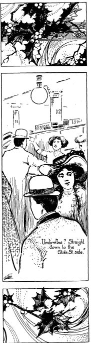 “Fifty an’ fifty and one—two dollars. Mam? O yes, mam. Merry Christmas! Mam? Same to you. (Aside to next saleswoman):