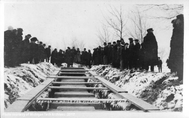 A bleak mining region and the rigors of a Lake Superior winter, with the hardship of five months’ strike, made still more poignant the crushing sorrow. Over the two miles of road from Calumet to the bit of ground owned by the Western Federation of Miners marched the procession with hearse, undertakers’ wagons and an automobile truck carrying a few coffins, followed by 480 miners, in squads of four, carrying 67 coffins. They lowered them into two long trenches that yawned in the snows of the copper country. Behind them came fifty Cornish miners chanting hymns, their voices thick with emotion. Thousands of miners with their wives and children formed the procession. All but a dozen of the burials were in common graves dug by members of the union.