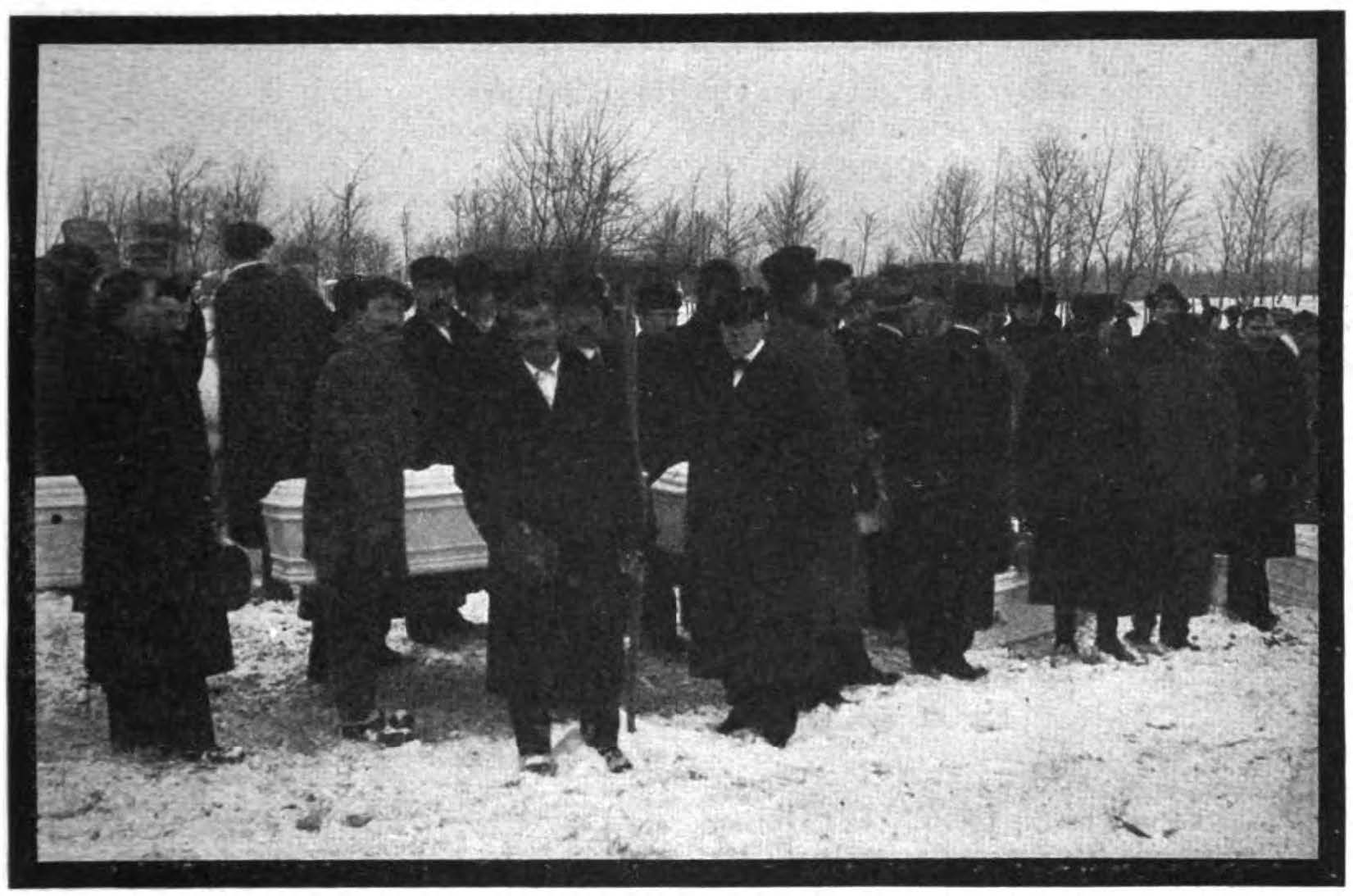 A bleak mining region and the rigors of a Lake Superior winter, with the hardship of five months’ strike, made still more poignant the crushing sorrow. Over the two miles of road from Calumet to the bit of ground owned by the Western Federation of Miners marched the procession with hearse, undertakers’ wagons and an automobile truck carrying a few coffins, followed by 480 miners, in squads of four, carrying 67 coffins. They lowered them into two long trenches that yawned in the snows of the copper country. Behind them came fifty Cornish miners chanting hymns, their voices thick with emotion. Thousands of miners with their wives and children formed the procession. All but a dozen of the burials were in common graves dug by members of the union.