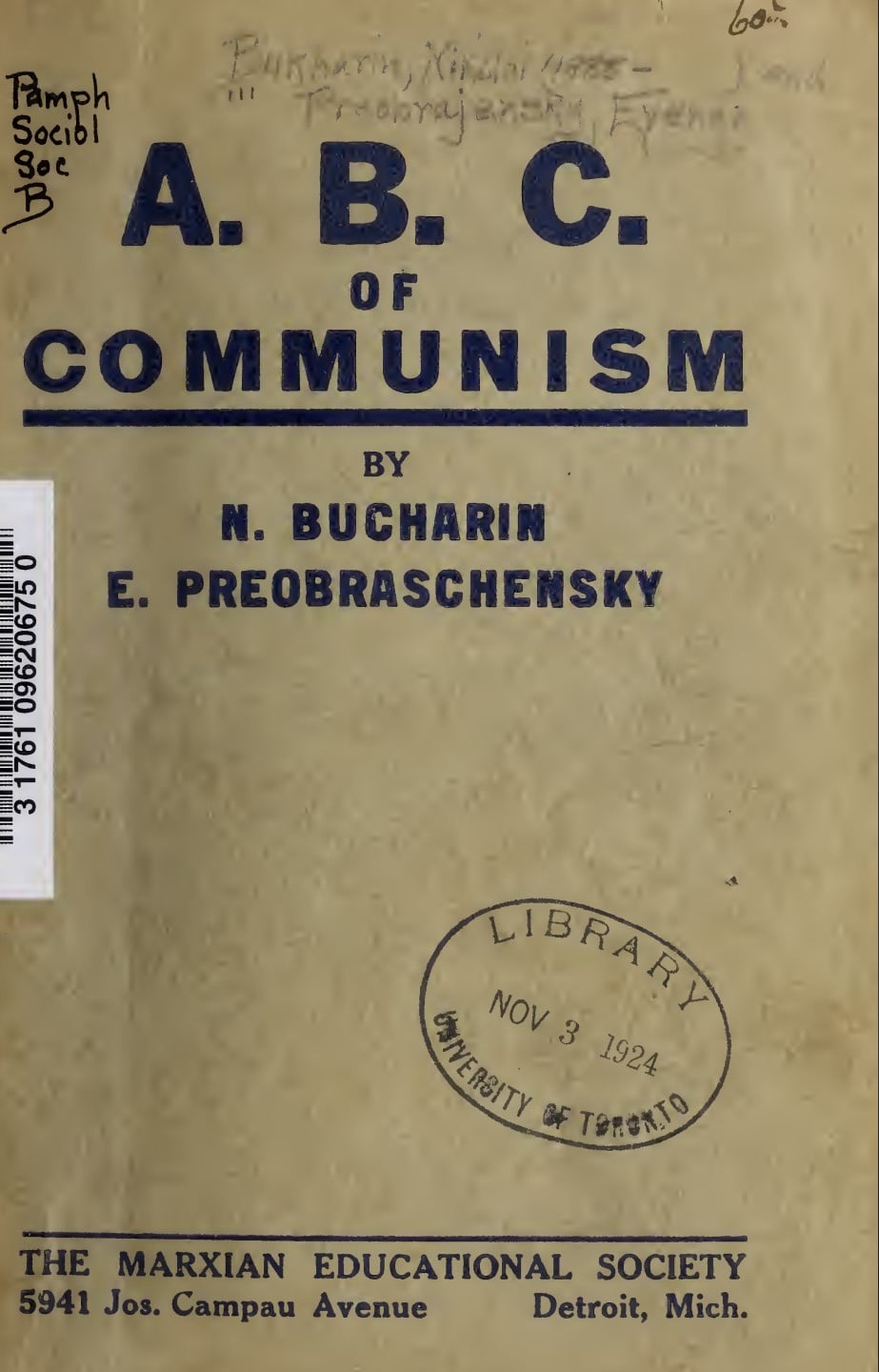 The Marxian Educational Society (appears) to have been a pro-Comintern group centered in Detroit that emerged from the forces of the Proletarian Party which dominated the post-World War One (and earlier) Left Wing in the city. They were responsible for publishing several of the classic works of the early Soviet experience and seem (?) to have joined the Workers (Communist) Party at its founding convention in December, 1921.