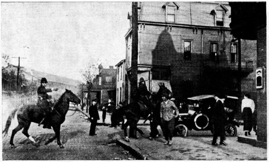 In this kind of a strike, then, you can expect plenty of terror. Already ten men have been shot for picketing, fortunately none of them killed. Strikers are shot at by state police, coal and iron police, and deputy sheriffs. State troopers, deputies, and green khaki coal and iron cops ride madly over the countryside, armed with tear gas, clubs, and all kinds of guns: shot guns, pistols, rifles, and machine guns.