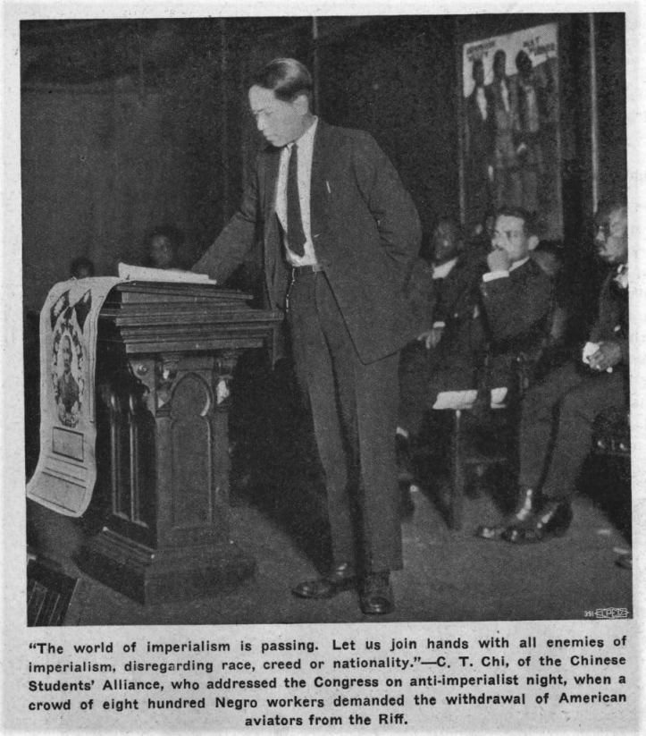 C. T. Chi, in his speech following Manuel Gomez, greeted the assembled workers and greeted the American Negro Labor Congress in the same of the workers of China.