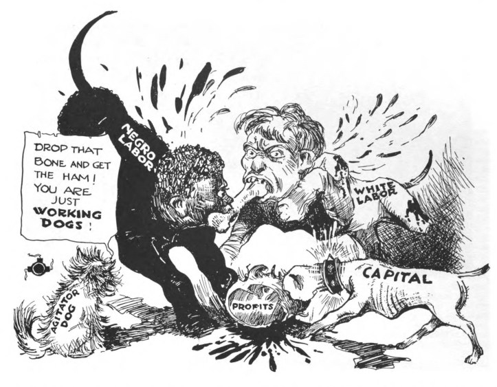 The I.W.W. prohibit discrimination on account of race or color in the first clause of their constitution, and they carry it out in practice. The recent convention of the American Federation of Labor held in Atlantic City, went on record as favoring the organization of all Negro workers. In addition to this, the Negroes have shown a marked tendency toward unionizing among themselves. They have formed the National Brotherhood Association of America, which is an organization on the order of the United Hebrew Trades. (Just as the Hebrew Trades was organized to protect Jewish workers, so the National Brotherhood Association was organized to protect Negro workers.) At the convention of the Virginia State Federation of Labor in Alexandria, Va., June of this year, 30 Negroes were seated and took an active part in the proceedings. Everywhere the white and black workers show signs of co-operation in combining against the common enemy–Capitalism. This, naturally, breeds its counter-irritant–the attempt, on the part of capital, represented in the banks, railroads, manufacturers, packers and mine owners to divide the workers to get the black and white working dogs to fighting over the bone of race prejudice in order that they, the yellow capitalist dogs, may get away with the meat. And this illustration carries with it more than the figure. It is very apt, for it is literally true.