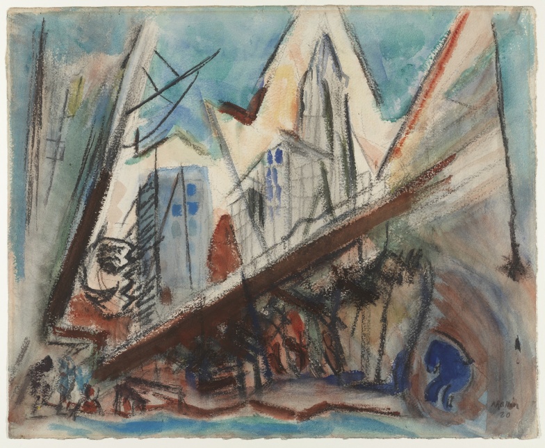We hope this will not be wholly true, however. The beauty of the natural world he has seen and recorded is part of our tradition today, even though the circumstances of life do not permit most men and women to possess that beauty. The waves which Winslow Homer and Ryder also painted with great beauty will not always whisper with the diminuendo note of Matthew Arnold’s “Dover Beach.” New Mexico’s fang-shaped mountain ranges will not always speak only of the austere loneliness of existence, nor will Manhattan’s skyscrapers always seem about to destroy the human midgets who created them. When order and a nobly classic life have been built in the world, it will be possible to observe that this was the order and the form Marin in his water colors and oils was seeking to impose single-handed on nature. Meanwhile we should value this work as an organic part of the historical evolution of American art.