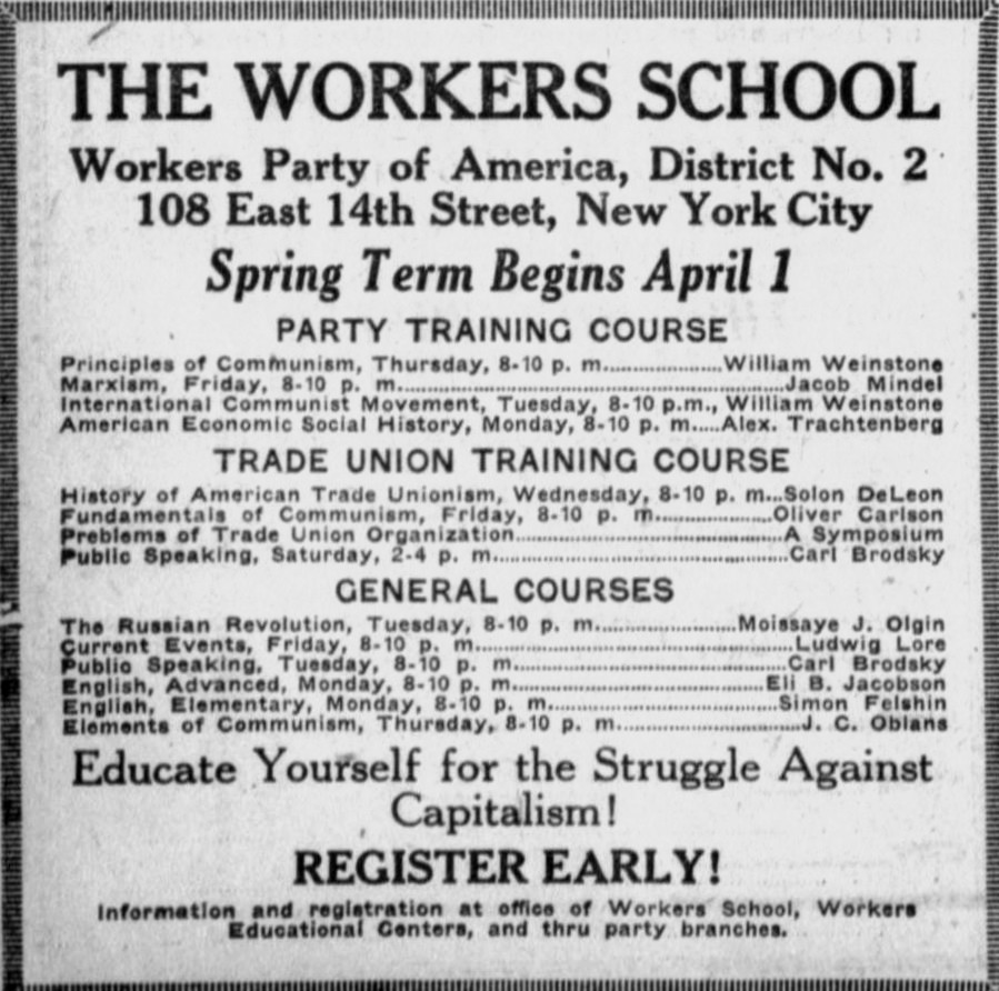 THE WORKERS SCHOOL marks the first serious attempt of the Workers Party to set up a permanent educational institution in the New York district. Organized originally as a private undertaking by a group of comrades not directly responsible for the work to the party, the school became an instrument for Communist training and the spreading of Communist ideology when, about a year ago, it was brought under the direct control and supervision first of the district executive committee and later of the national executive committee of the Workers Party. The school is a Communist educational institution. It purposes to give workers that knowledge of labor history, of the principles and tactics of Communism, which is indispensable for militant action in the struggle against capitalism.