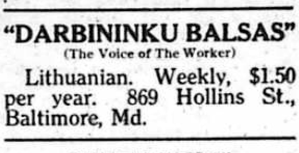 Led by Leo Grikstos, radical Lithuanians publish Darbininku Balsas (The Voice of the Workers) out of Baltimore to organize Lithuanian speakers into the One Big Union.