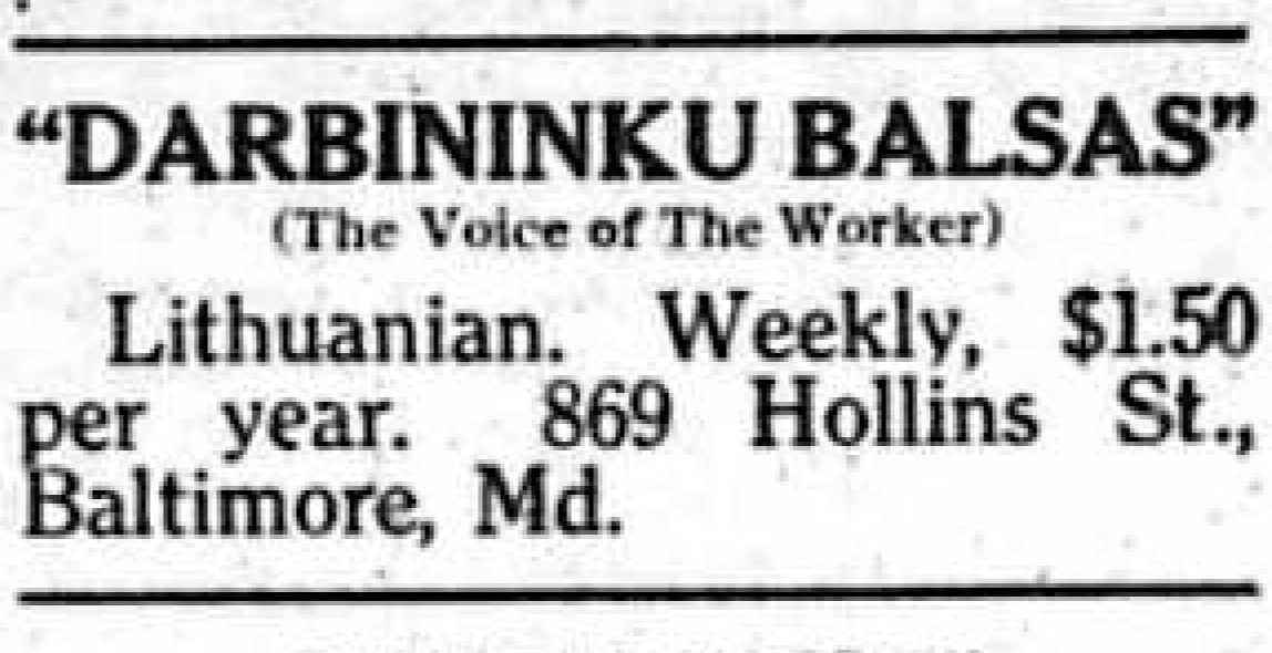 Led by Leo Grikstos, radical Lithuanians publish Darbininku Balsas (The Voice of the Workers) out of Baltimore to organize Lithuanian speakers into the One Big Union.