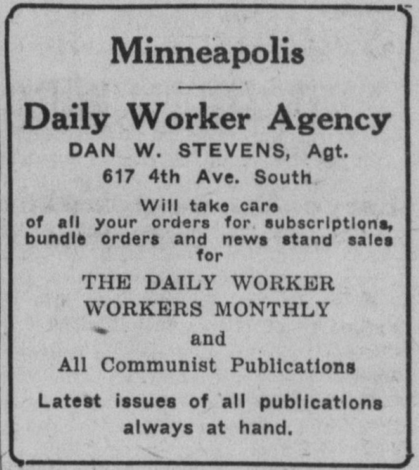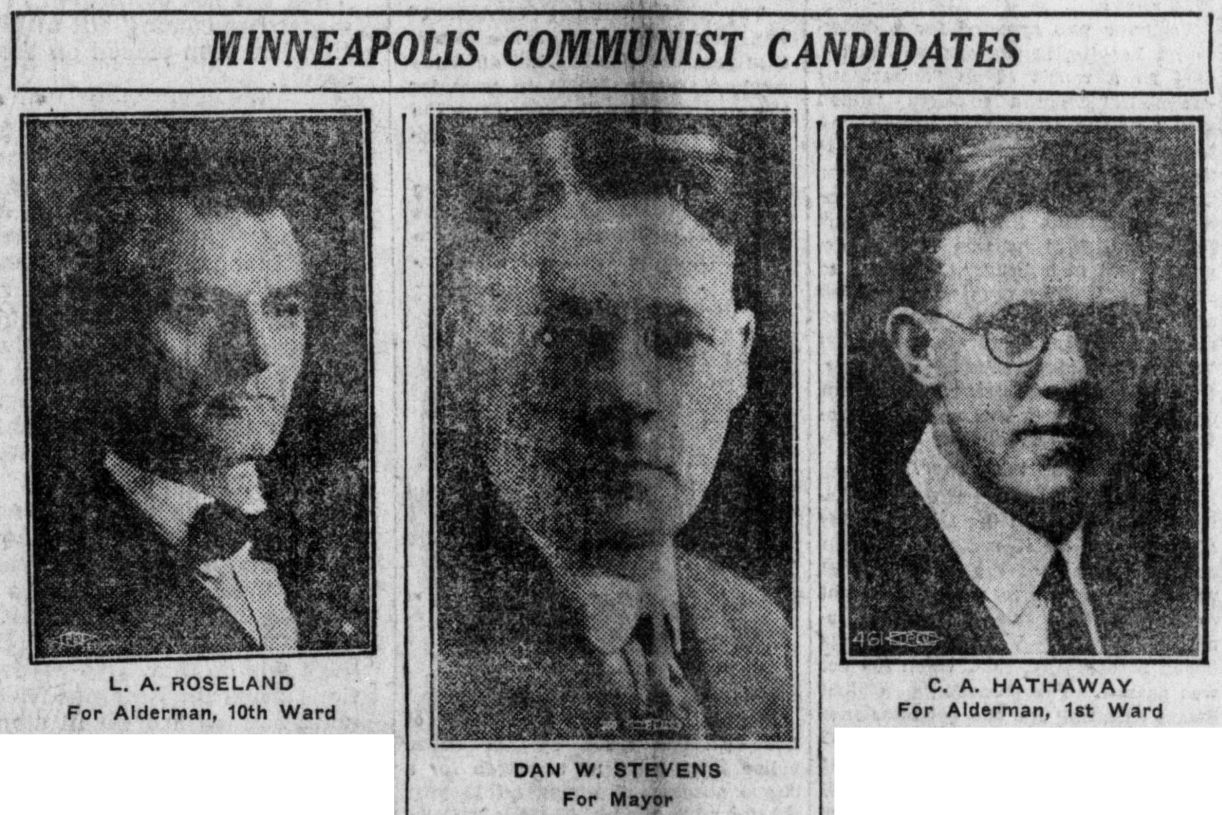 Dan W. Stevens, militant trade unionist, who was expelled from the central labor body in Minneapolis on instructions from headquarters of the American Federation of Labor in Washington, is running for mayor in Minneapolis on the Communist ticket as the candidate of the Workers Party. Stevens is running on a platform that puts forward the interests of the workers and none else, he is the only candidate in the field who cares a tinker’s damn about the working class. The workers realize this and the most politically conscious of them are rallying to his support despite the opposition of the fakers, old and new, who are lined up behind the republican party hack, the present Mayor Leach.