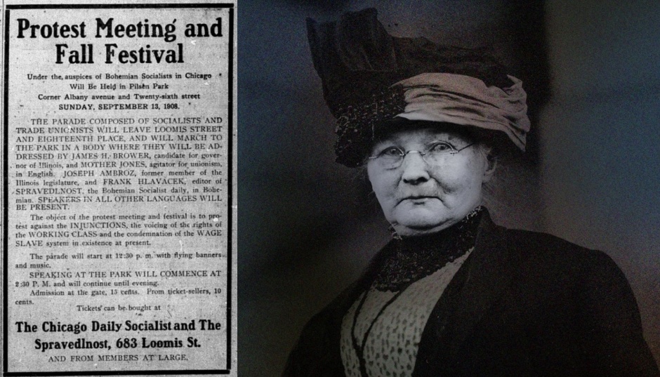 What must have been quite a day. Mother Jones speaks at a Chicago fall festival and workers’ protest against the wage-slave system sponsored by Czech Socialists and held in that city’s Pilsen Park after a street parade leaving from the offices of the newspaper Spravedlnost.
