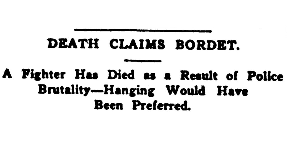 When one thinks of Bordet lying on his deathbed, can he help but revolt against the damnable system that allows a brute to tyranize over a fighter for the right, like Bordet, and through blows and exposure condemn him to torture such as is the lot of few men to suffer.