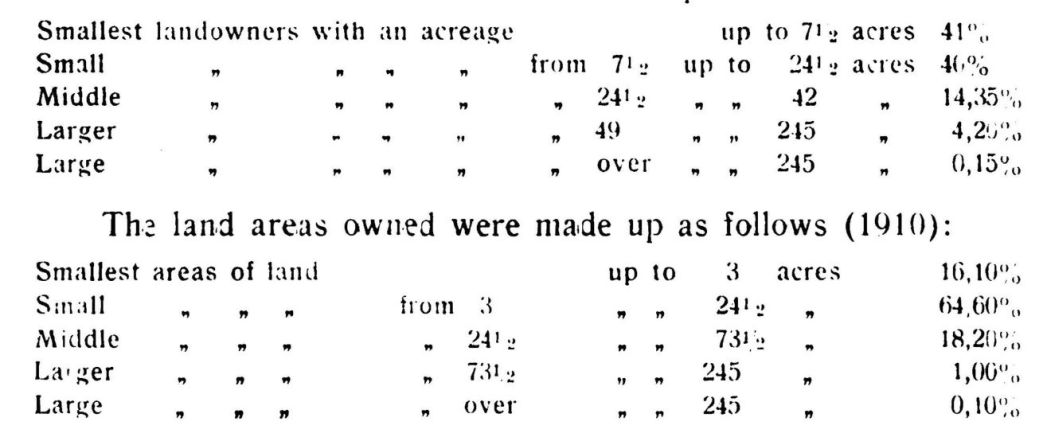 In 1908, the total area of land under cultivation amounted to 19,716,653 acres; of these, 11,436,305 acres were in private hands, divided between 705,820 owners. According to the area of land owned, the owners were made up as follows: