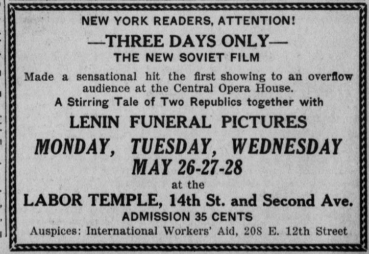 “Lenin Memorial,” one short reel, showing events of the life of the greatest working leader of our time.