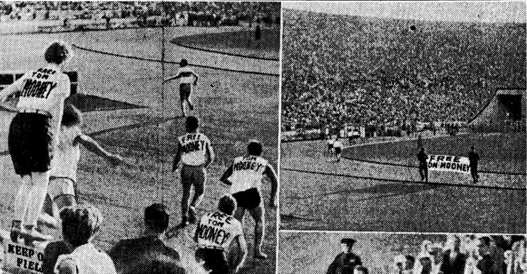 Throughout the grandstands, leaflets by the thousands were being hurled in all directions. Countless hands grabbed them. “Free Tom Mooney” stood out in bold faced type. No one seemed to know who threw the leaflets.