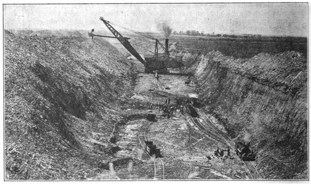 This enormous change has been entirely due to the introduction of monster steam shovels. Machines, larger than any of their kind in the world, that takes several tons of earth and rock out of the ground and move it to a spot two hundred feet away with as much speed and ease as a man can take a shovelful and move it ten feet, are now used.
