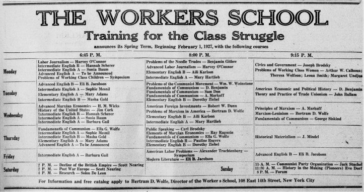 Much in this text of a speech by Wolfe, as director of the C.P.’s New York Workers’ School, to the Conference of Teachers in Workers’ Education held at Brookwood Labor College in Februar7, 1926.