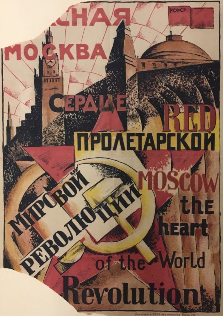 You will find posters on every wall, in a thousand stores of Moscow, on telephone poles, in rooms, in factories; they are everywhere. Picture posters for propaganda purposes. Perhaps a proletarian rock, flaunting a red flag, with a capitalist ship going to pieces at the foot of it. Or a poster recruiting for the Communist Saturdays, with a description of the consequences of laziness, and beside it the results of industrious work. Or else a picture poster attacking the old greasy Czarist officials, the pot-bellied popes and the aggressive military officers. Placards with red stars, recruiting posters of the Communist Party, showing a procession of workers passing by some representatives of the old order with an air of refusal, and entering a house upon whose gable are the initials of the party.