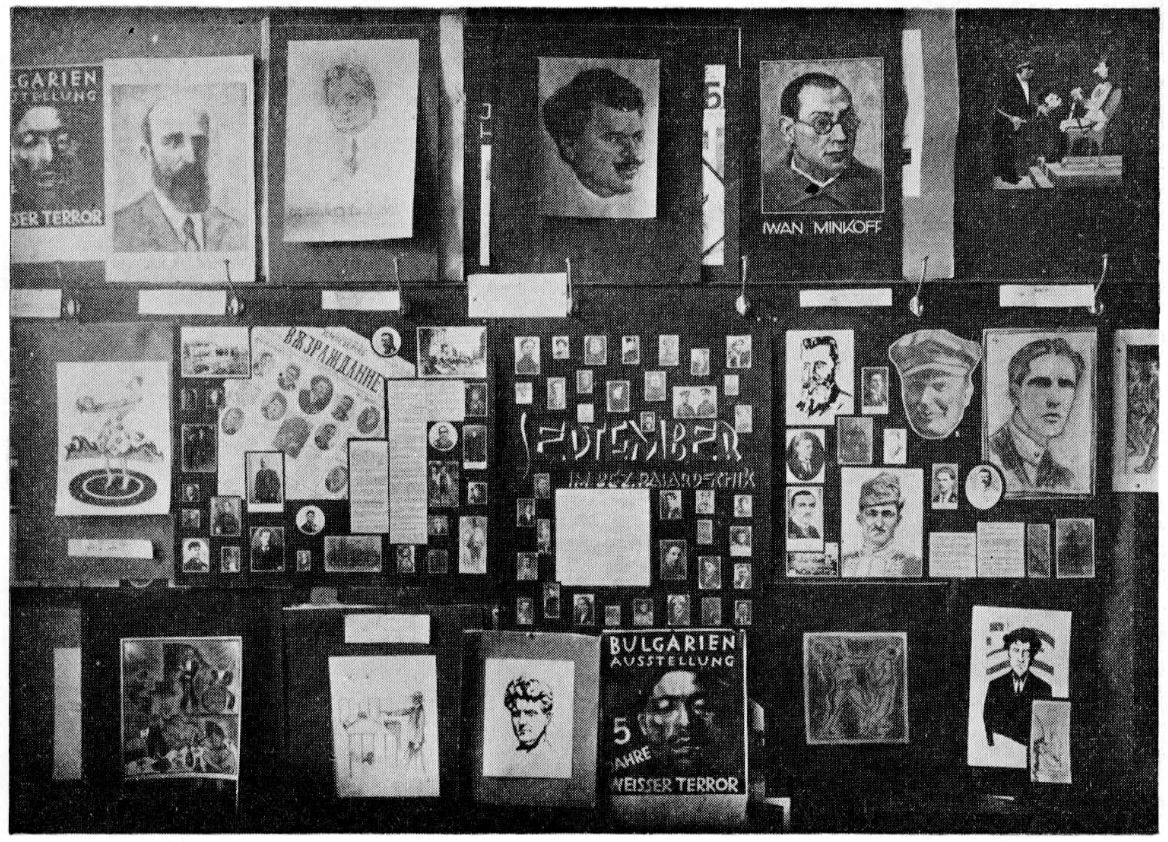 The exhibition “Five Years of White Terror in Bulgaria” was divided in several departments. First, the department of the press: There was exhibited a tableau in black mourning with photographs of the forty-four Bulgarian journalists killed or “disappeared”, victims of the White Terror and the “death list” of the forty-six Bulgarian papers and magazines suppressed by the fascist government.