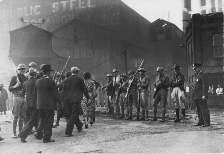 From Pittsburgh to Clairton is a distance of some 15 miles, and on each side of the Monongahela River can be found many of the largest steel mills in the country. All are surrounded by newly uniformed and recently deputized gunmen, carrying heavy rifles, wide cartridge belts, pockets bulging with blackjacks, and the butt of a heavy revolver protruding significantly from its leather holster fastened to each well-groomed body.