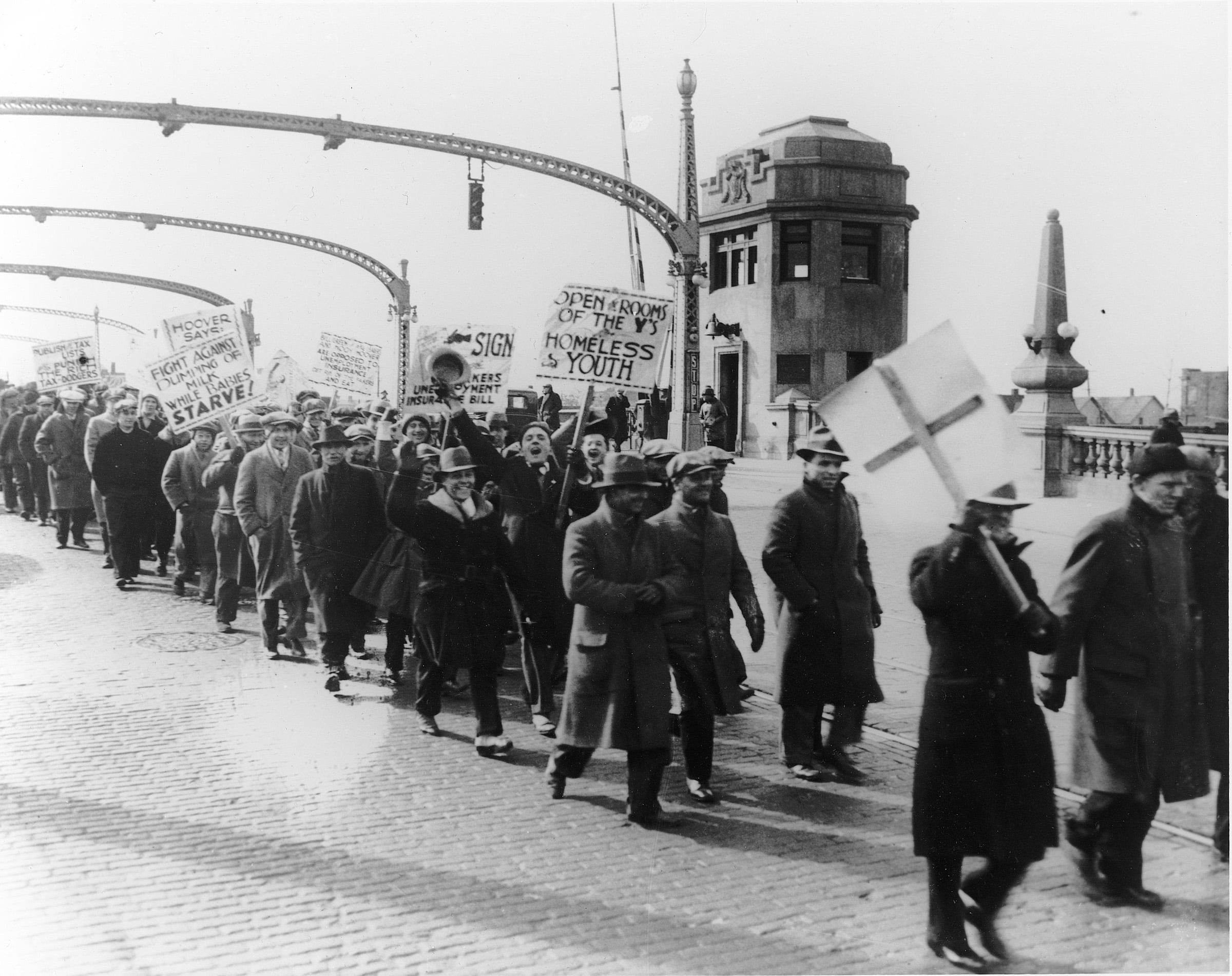 The Hunger March to the Ford Plant began at the corner of Fort Street and Oakland with over 1,300 workers present and hundreds more streaming in by car, auto and truck. The line of march started along Fort Road until it reached the Dearborn City line.