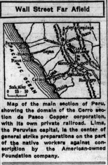 As the latest news from Peru indicates, the Foundation company is doing even better than Cerro de Pasco in the matter of securing cheap labor for its undertakings. The Foundation Company gets labor power for nothing at all. President Leguia was simply made a stockholder in the Foundation Company and conscription of workers was made the law of the land. There is nothing like a little imperialism, say the capitalists, to solve the “labor problem” at home!
