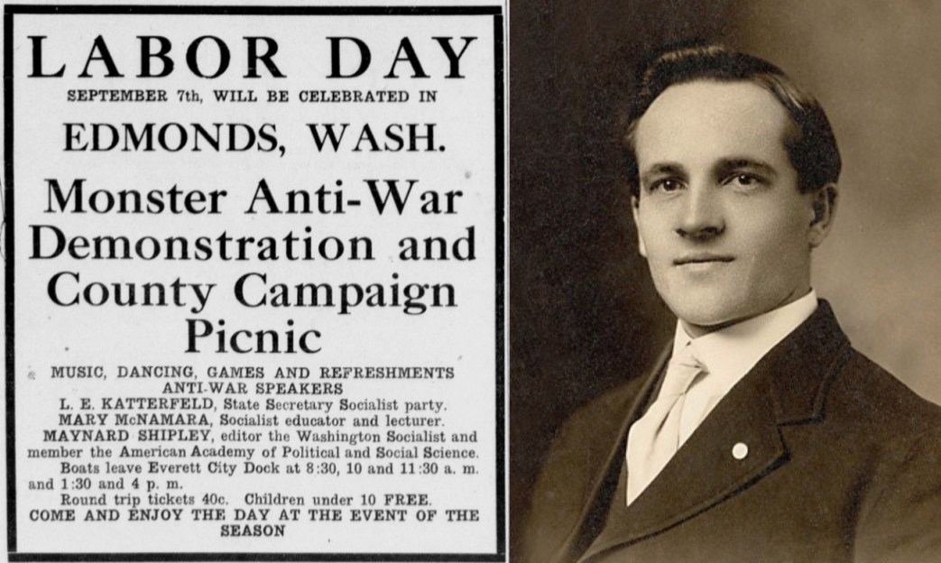 Snohomish county also will celebrate Labor Day with a combined picnic and anti-war protest meeting at Edmonds. The speakers of the day are to be Maynard Shipley, L.E. Katterfeld and Mary McNamara. Two steamers have been chartered to convey the crowds from Everett to the city park at Edmonds for the low round trip fare of forty cents.