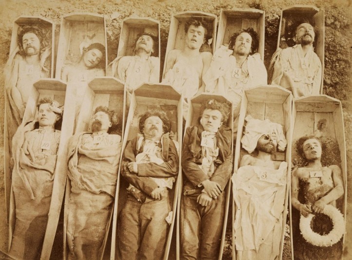 Civilians whom good fortune saved from immediate death, were taken for trial before one of the numerous court-martials. The “trial” never lasted more than a few minutes, and death was the sentence in fully half the cases. The bodies were left lying in the Paris streets, or half buried in haste.