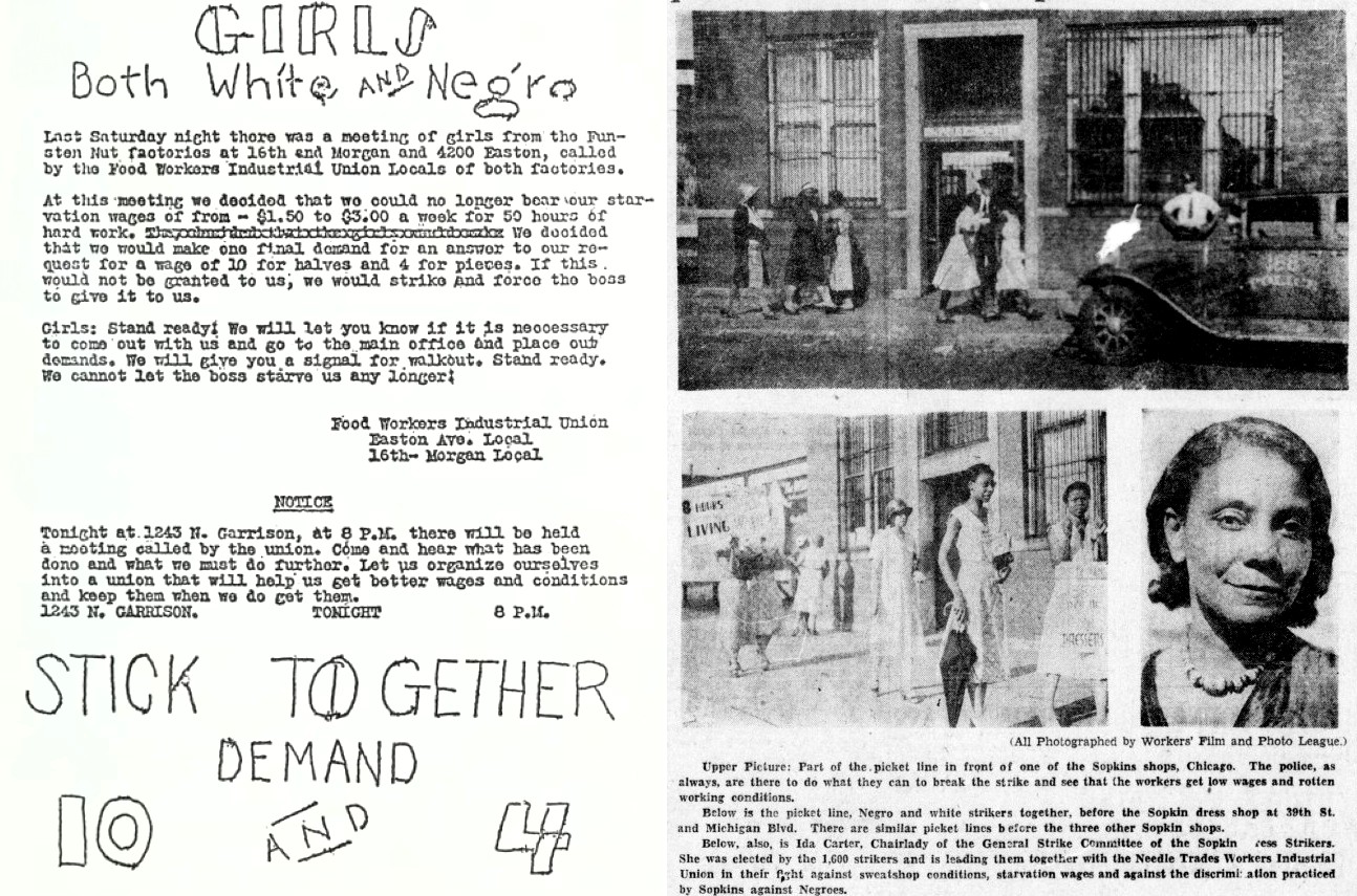 The C.P.’s District Organizer from the region on two strikes at workplaces of majority Black women, heralding a change in the labor movement. 1933’s Funsten Nut strike led by T.U.U.L.’s Food Workers’ Industrial Union was successful in St. Louis, while in Chicago the Sopkins dress shops were struck by the Needle Trades Workers Industrial Union for two weeks.