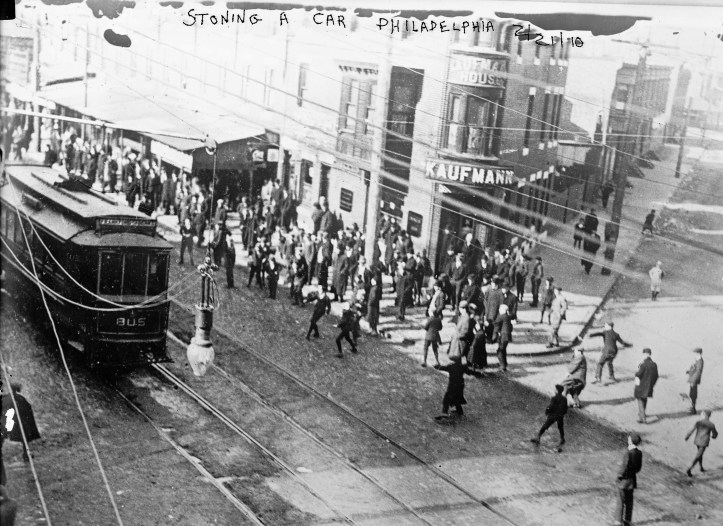 Today bands or children paraded the streets, singing: “Who are we? Who are we? We are the strikers of the P.R.T.” Department stores have cut their advertising in the daily papers in half as there are few people getting into town to do any shopping. Everywhere there are crowds of people moving about the streets, but no serious disorders have occurred today. In fact, the crowds are all good natured and it seems the people of Philadelphia are rather enjoying the predicament in which the traction trust has placed itself as the result of its effort to break up the union.