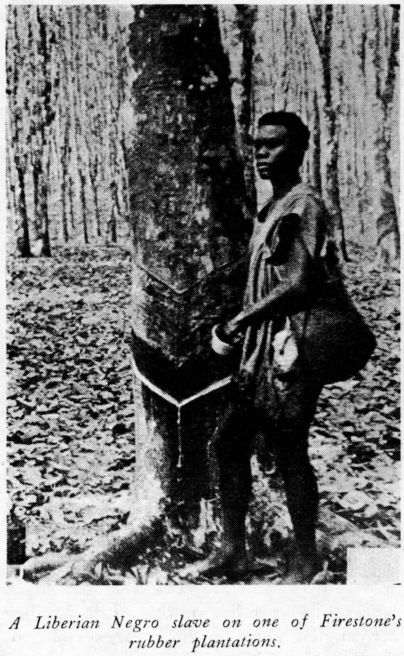 Firestone is the one big capitalist in Liberia. And he has, according to competent observers, been exploiting the Negro workers there by one of the worst forms of colonial slavery. He pays money to chiefs of native tribes who in turn force their people to work for him. He pays the government and chiefs about a cent a man per day. The chiefs and the government do the rest.