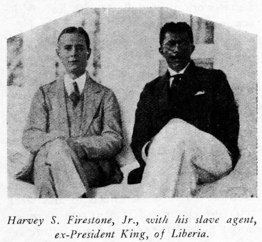 But the fact is that Liberia was run on the orders of the Washington-Wall Street government in the very days when its slavery system was in full flower. It was the Coolidge-Hoover regime that helped Firestone grab his fat concession, was the same set of polished hypocrites who picked the expensive financial advisors who, since 1927, has been dictating the public expenditures and regulating the military establishment of the country. And it was only after the rubber deal had been put through, with stout State Department pressure, that the Finance Corporation of America (a Firestone firm) in 1927 granted a $5,000,000 loan at 7% to the Liberian government. It was the now-discredited President King of Liberia who was the willing agent in these deals. All of which were so shady that the State Department refused to give out the text of the agreements entered into between Firestone, the National City Bank and the Liberian puppets. And King in 1928 issued a statement through the U.S. State Department that there was no forced labor in Liberia!